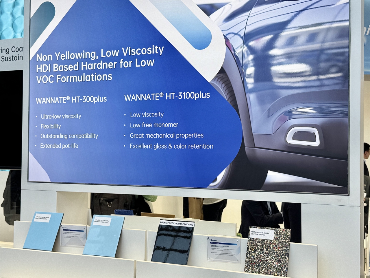 萬華化學重點展示了多款高性能異氰酸酯固化劑,滿足市場對環保和高效的需求。低黏型——WANNATE® HT-300 plus、WANNATE® HT-3100 plus和WANNATE® HB-200在降低體系VOC排放的同時,還可顯著提高施工效率。快干型——WANNATE® IT-170B/S,憑借其優異的耐化學品性和快干性能,廣泛應用于汽車漆、修補漆和工業漆,幫助客戶縮短干燥時間,降低能耗。封端型——WANNATE® HTBL/ITBL則以其卓越的耐候性和耐化學品性,成為卷鋼涂料和金屬烤漆的理想選擇,其中ITBL通過FDA認證,可直接用于食品接觸領域。