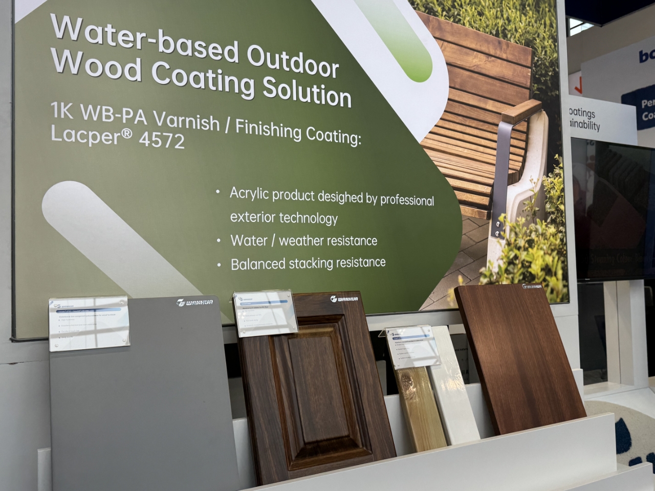 從家居到建筑,由室內到戶外的涂料解決方案,萬華化學一應俱全。通用家具的水性2k方案,具有極佳的外觀表現,高硬度,高化學品抗性,高耐磨,良好的施工性,為木器家具提供更佳使用體驗。針對戶外木器,高光高通透的Lacper® 4572,具有優秀的耐水、耐候性和抗回粘性能,讓木器經得住風吹日曬。此外,本次展會還推出了高性能地板UV樹脂,應用于PVC地板領域,賦予地板更高的耐磨性以及耐污性。